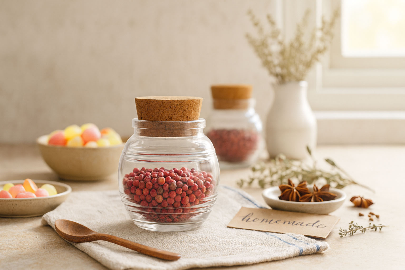 La serie "Jule" combina una elegancia estética con funcionalidad práctica y ofrece una solución estilosa para guardar especias, caramelos y otras delicadezas. El frasco de corcho con forma esférica destaca por su forma suavemente redondeada y el característico relieve de rayas, que le aporta una textura especial y un encanto nostálgico. La base redonda asegura una apariencia armoniosa, mientras que la boca de corcho permite un cierre seguro y natural. Jule no es solo un frasco práctico para almacenamiento, sino también un elemento decorativo que aporta un toque especial a cualquier cocina o mesa.