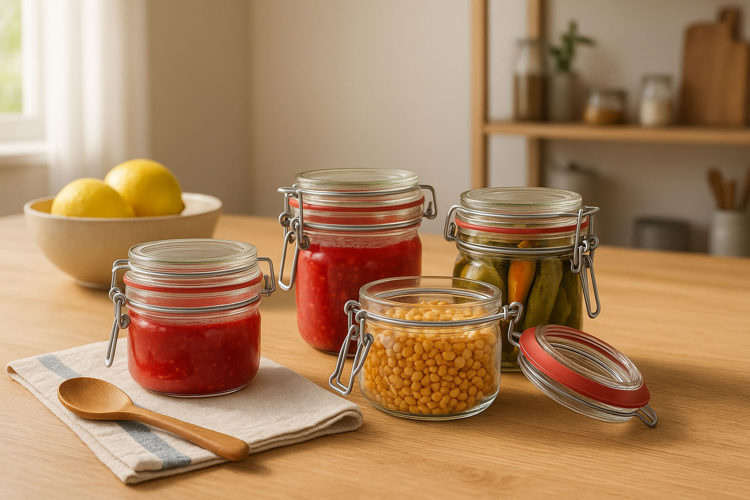 Los tarros con cierre de alambre son ideales para cocinar y conservar especialidades caseras como mermeladas, chutneys o verduras en escabeche. También ofrecen una solución higiénica y elegante para almacenar alimentos secos como muesli, harina o legumbres.