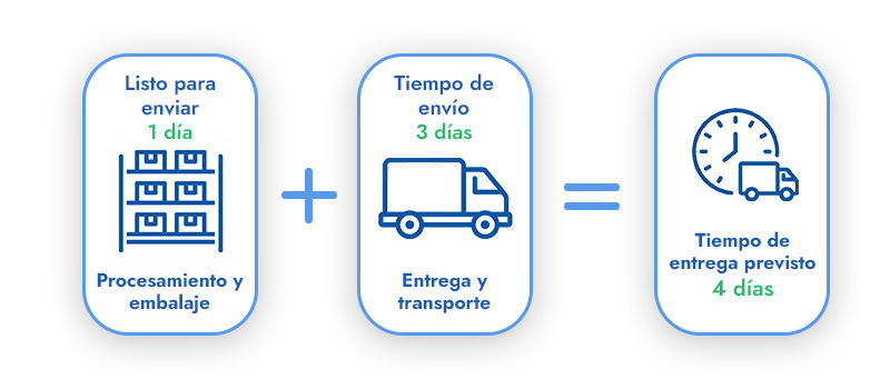 «Listo para enviar» se refiere al tiempo que necesita nuestra empresa para procesar su pedido y prepararlo para el envío. Comienza con la recepción de su pedido y finaliza cuando su paquete está listo para que lo recoja el servicio de mensajería.