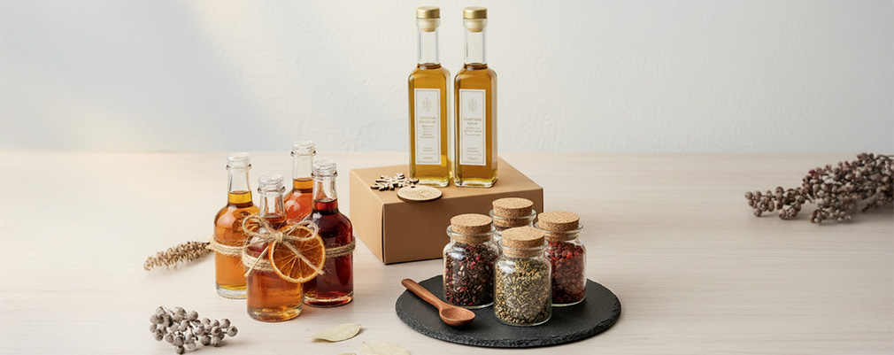 - Botellas variadas para aceites y vinagres: desde la Dorica redonda hasta la Marasca cuadrada, adecuadas para especialidades mediterráneas y regionales.