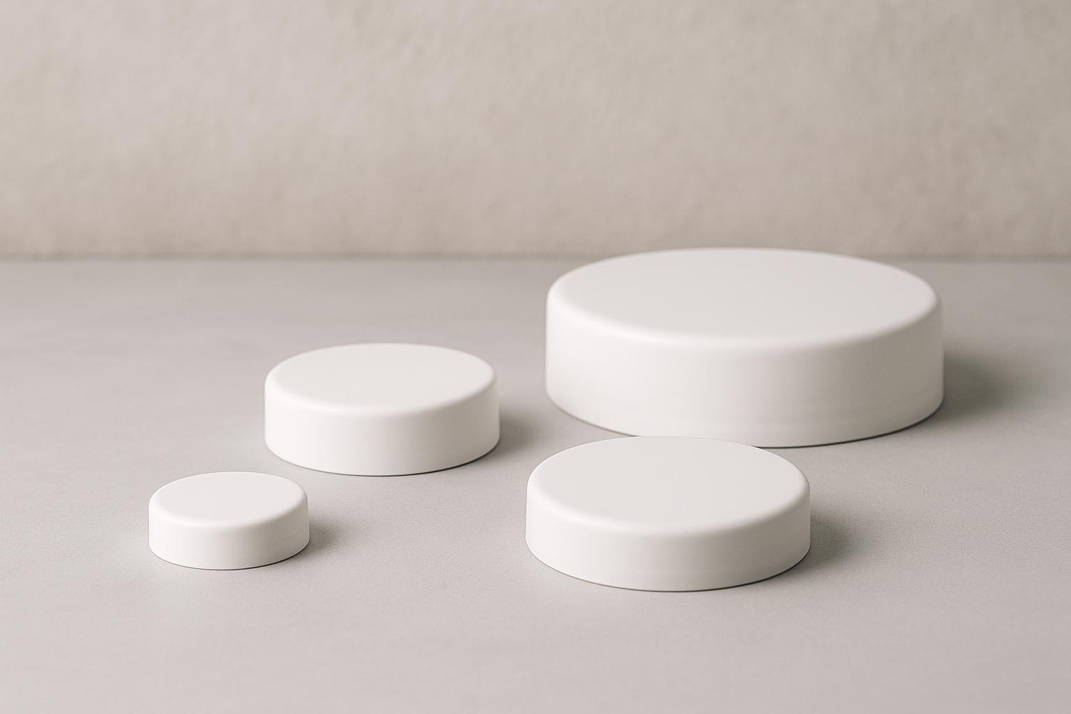 Las tapas de rosca 'Magic' de polipropileno blanco (PP) ofrecen una solución segura, duradera e higiénica para sus envases de cosméticos. Son resistentes al frío, a los rayos UV y aptas para lavavajillas, ideales para el uso diario en laboratorio, estudio de cosmética o en el hogar. El material robusto garantiza un sellado fiable y protege cremas, lociones y otros productos delicados de la humedad y las impurezas.